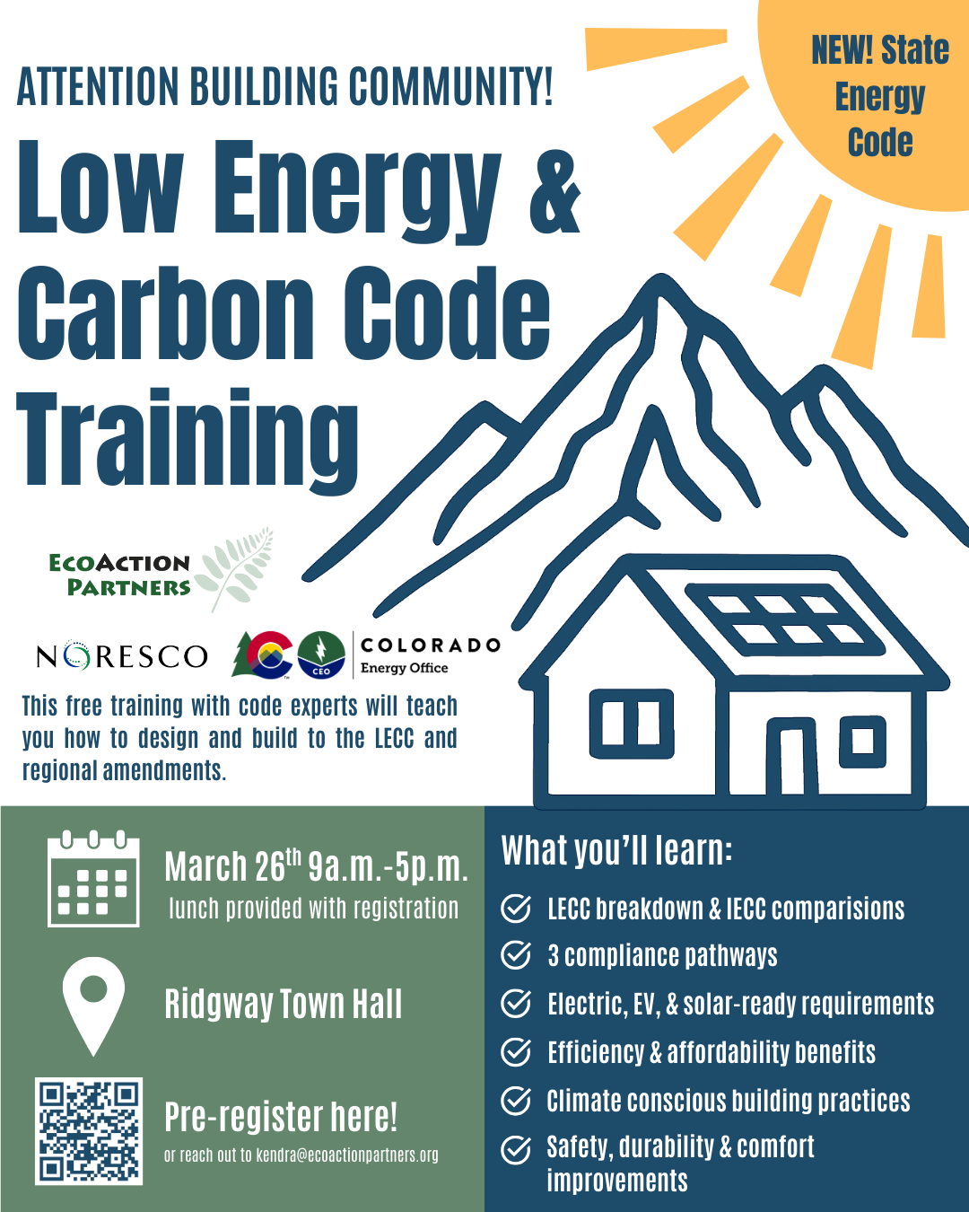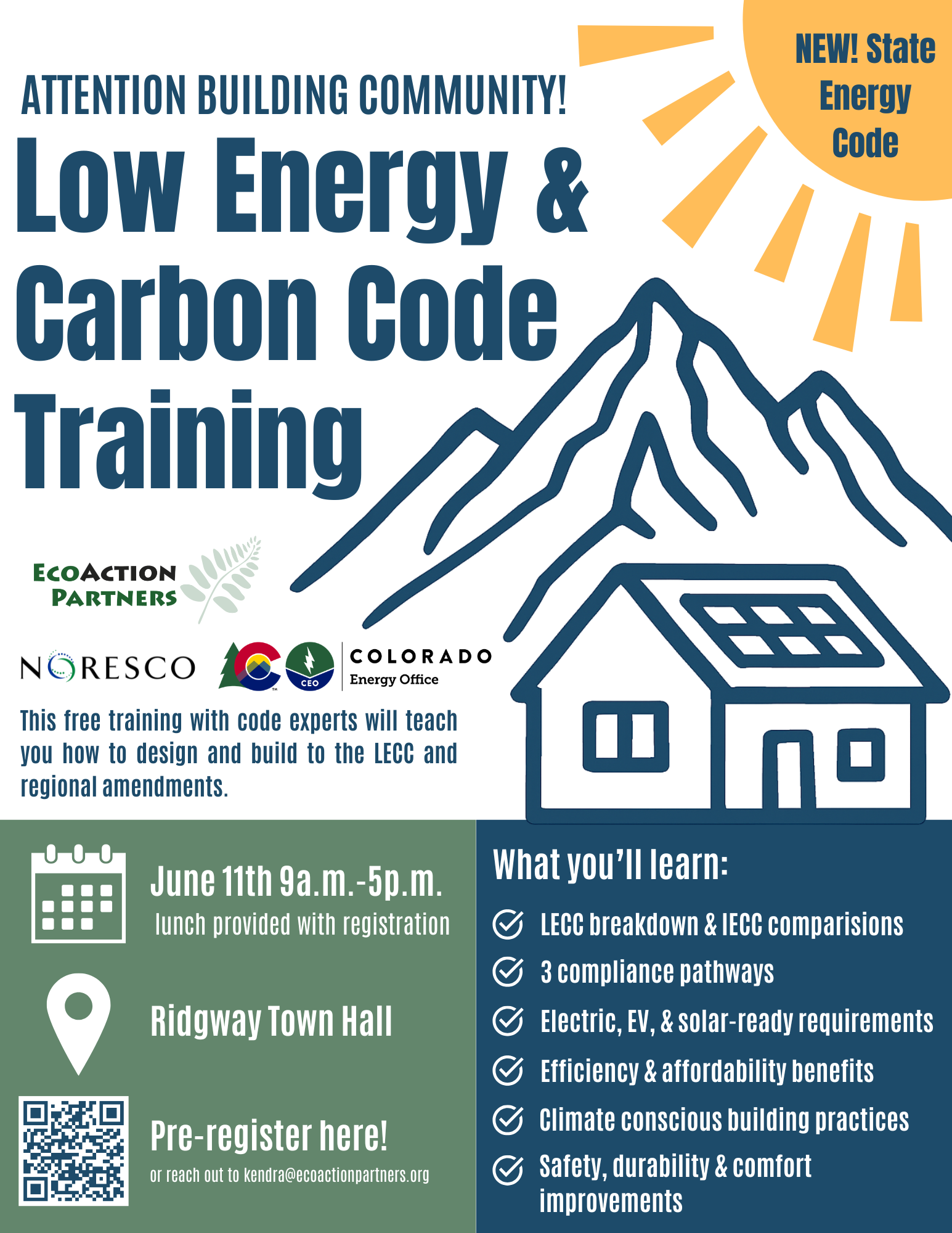 EcoAction Partners is facilitating a regional cohort across San Miguel, Ouray and San Juan counties to support collaborative discussion and implementation support for the state's building energy code requirements. Regional building code consistency, with varying amendments as appropriate for each jurisdiction, has proven beneficial to the regional building community and for enforcement over the years. This work is funded by the Energy Code Adoption and Enforcement Grant Program, from the Colorado Energy Office, and supported by Lotus Engineering & Sustainability and NORESCO.